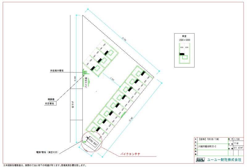| 設備・条件 | アスファルト敷き、場内照明、防犯カメラ、シャッタータイプ |